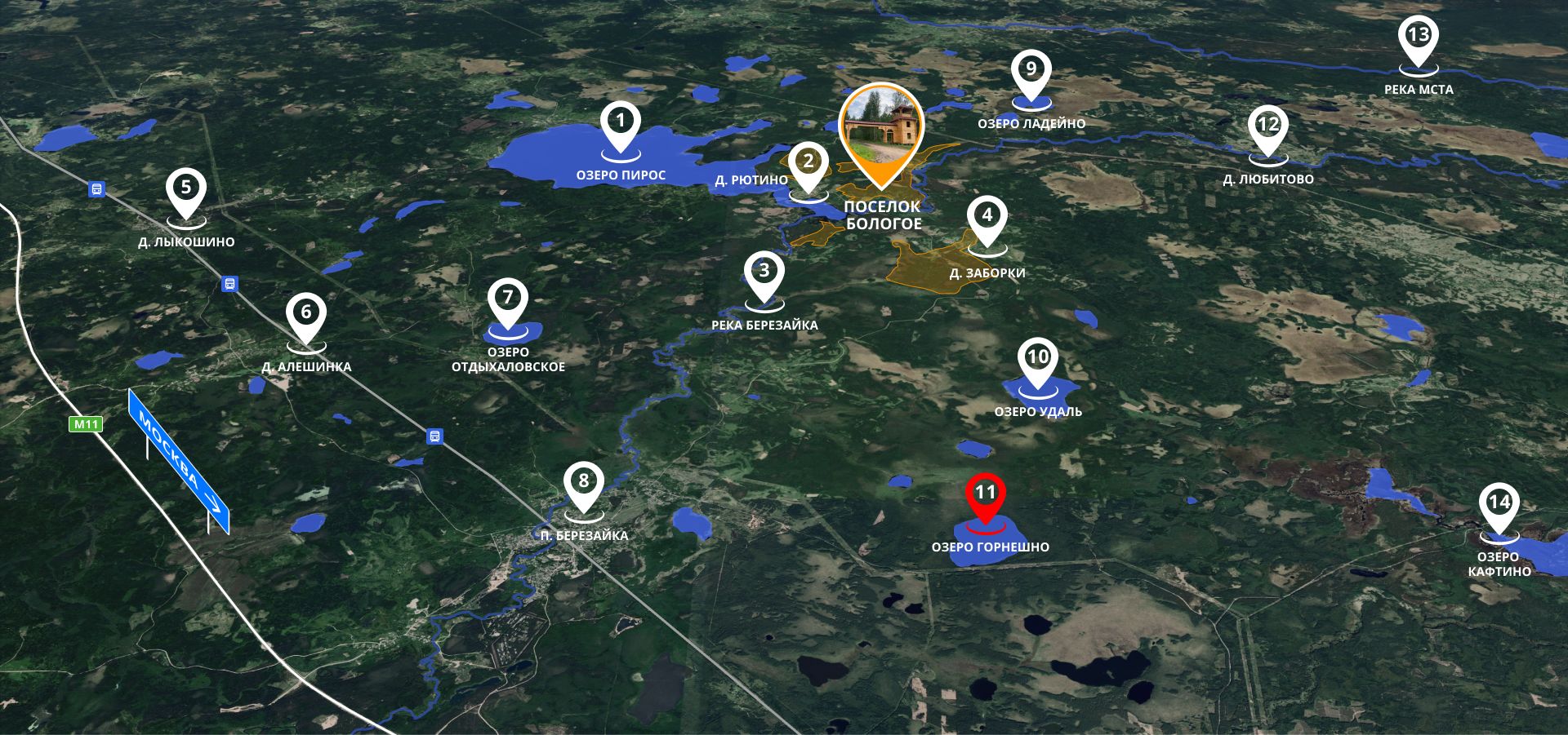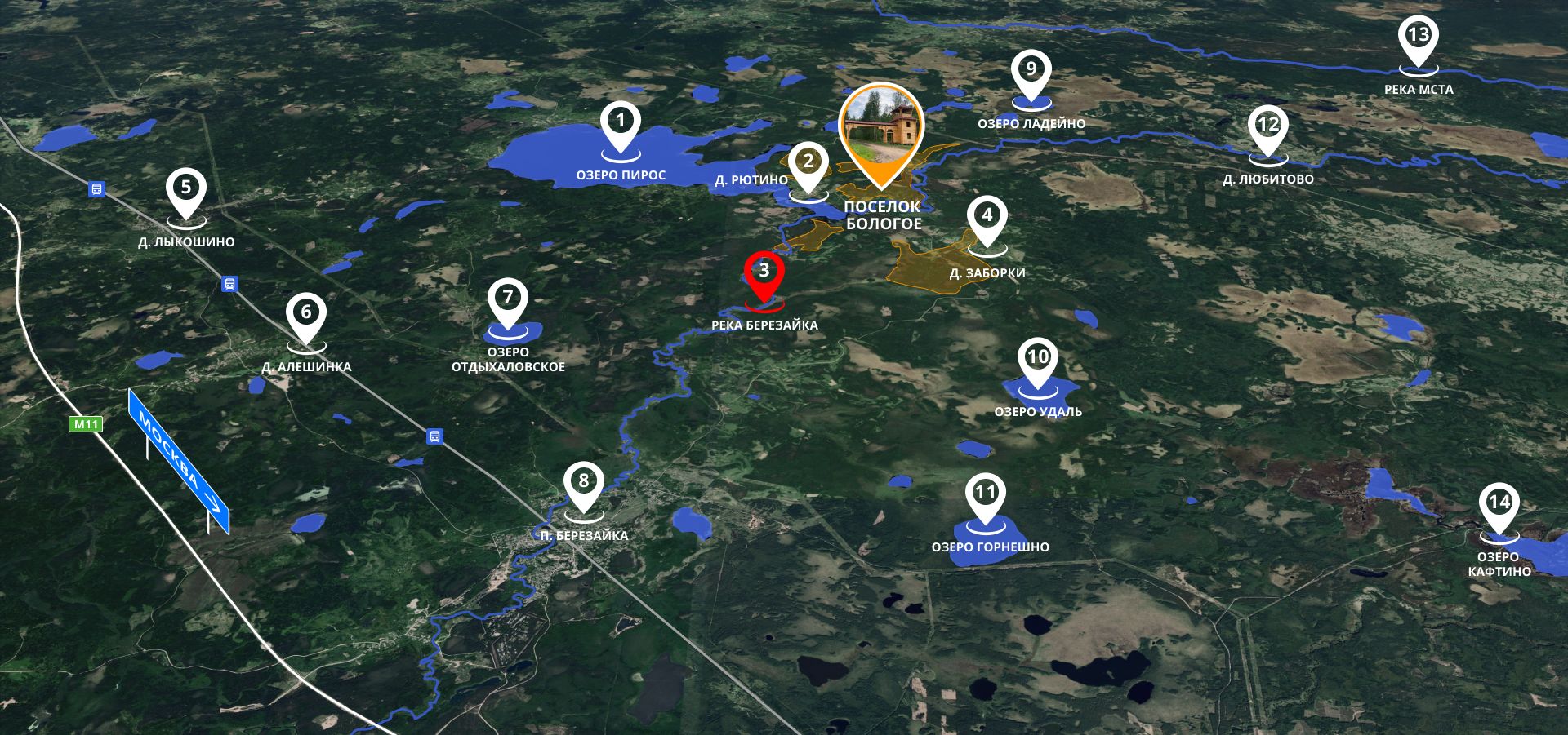 Поселок расположен в экологически чистом Бологовском районе вблизи деревни Рютино недалеко от озера Пирос. Рядом протекает река Березайка. В часе езды от поселка — город Бологое Тверской области, который расположен практически ровно посередине между двух главных городов страны: Санкт-Петербург (318 км) и Москва (331 км). В городе есть вся необходимая инфраструктура: магазины, аптеки, образовательные и медицинские учреждения, а также множество исторических мест и достопримечательностей, такие как церковь Троицы Живоначальной, храм-часовня Тихона Задонского, памятник-паровоз Эу706-10, памятник Любви и другие.